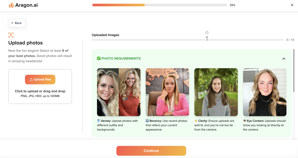 The platform couldn’t be simpler. First you, create a free account, and then the workflow takes you through 5 easy questions about your physical appearance from gender to eye color to hair (or lack thereof). Once answered, you then proceed to uploading 6 to 10 photos of yourself—think of this as the “before” in your makeover. The interface is refreshingly clean and user-friendly, allowing you to drag and drop photos or upload them with a click. While you don’t need professional photos to begin with, keep in mind that Aragon works best with clear, well-lit images (no heavy shadows or backlighting). Upload that awkward selfie from a dimly lit cafe, and Aragon may struggle a bit, but give it a decent photo, and it does wonders. The screenshot of the photo upload section below does a great job guiding you.