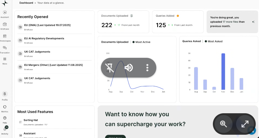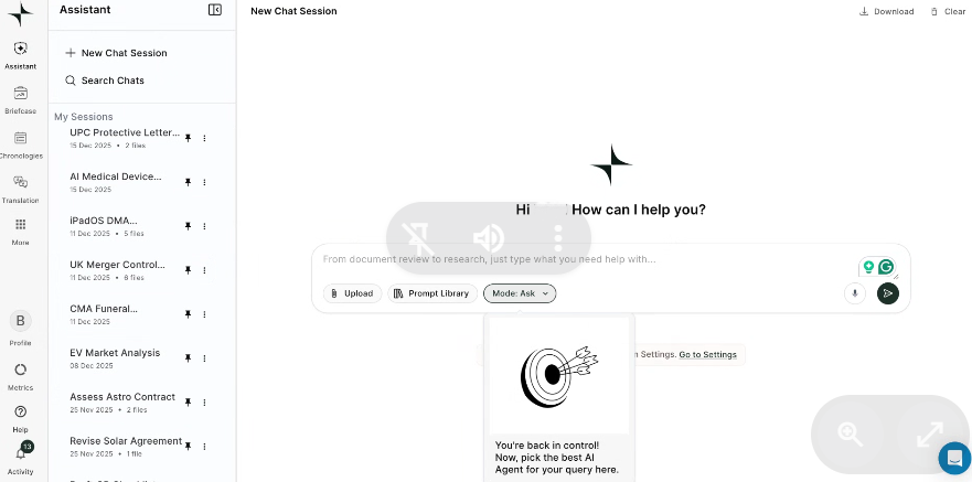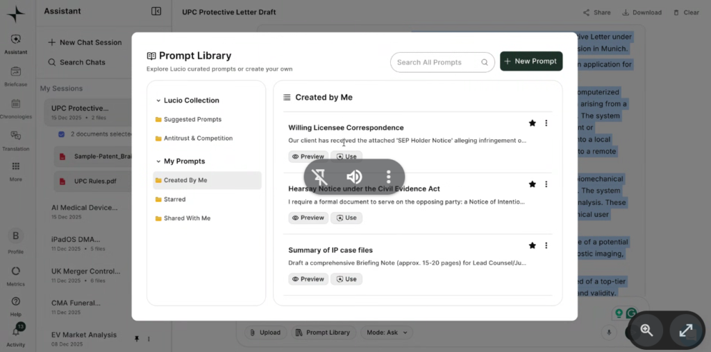 The Assistant interface is where the magic happens. Lucio organizes your work into chat sessions that you can name, save, and retrieve whenever you need them. You can see previous sessions like “UPC Protective Letter”, “AI Medical Device”, “UK Merger Control”, and “CMA Funeral”, each with its date and number of associated files. This means that if you worked on a case three weeks ago and need to resume it, you simply open that session and all the conversation, documents, and previous analysis are there waiting for you. You don’t have to start from scratch or remember what you asked the platform last time. Additionally, from this screen you can upload documents with one click, access your customized prompt library, or simply write your query in natural language.