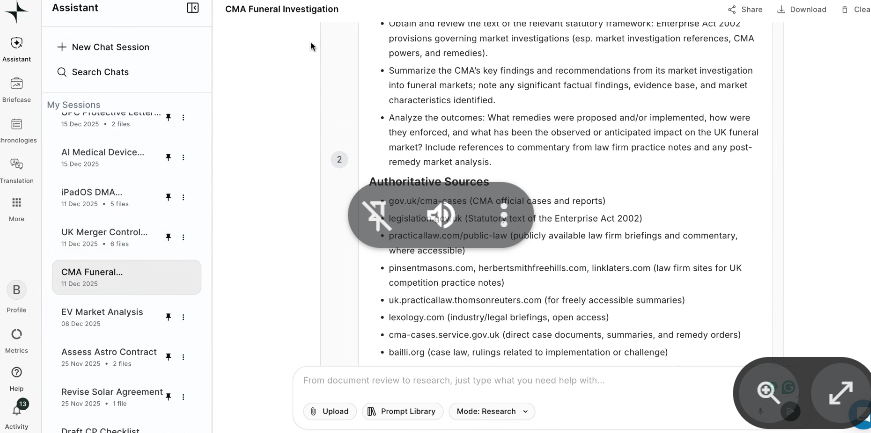 This is where Lucio truly differentiates itself from ChatGPT, Claude, or any generic A.I. When you ask it to research a specific legal topic, such as a CMA (Competition and Markets Authority) investigation in the UK funeral sector, Lucio doesn’t search for information on Wikipedia or random blogs. The platform automatically identifies the most authoritative and reliable sources: government websites like gov.uk/cma, official CMA reports, legislation.gov.uk for regulatory frameworks, legal databases like Practical Law and Bailii.org, and prestigious law firm websites with expert analysis. Each statement in the response is backed by these verifiable sources, and you can click on any citation to go directly to the original document. This level of rigor is exactly what you need when you’re preparing a case and can’t afford to work with unverified information.