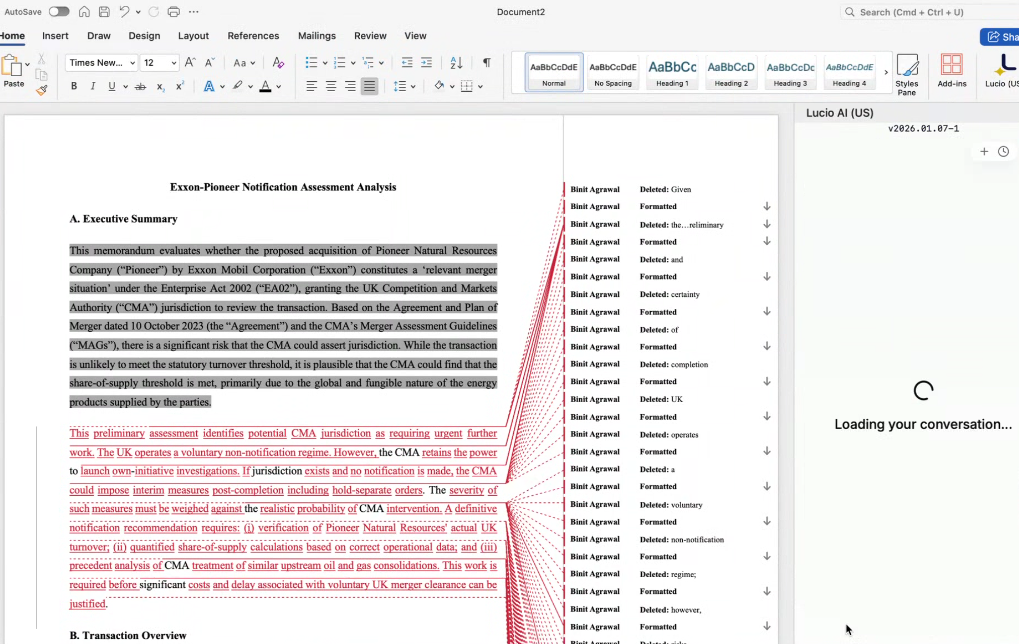 The real magic of Lucio lies in its ability to integrate seamlessly into your existing workflow. While drafting a merger notification analysis in Microsoft Word, Lucio appears as an intelligent side panel on the right. As you write, Lucio can review your draft in real-time, identify legal inconsistencies, suggest specific modifications with formatting codes and suggested deletions, and apply changes directly to the document without the need to copy and paste. The same happens with Outlook, where you can summarize long email chains with a single click, or with Lucio’s PDF reader, which allows you to ask specific questions about any document without having to leave the application. This native integration eliminates the cognitive friction of switching between multiple platforms, allowing you to maintain your focus where it really matters: on legal reasoning and case strategy.