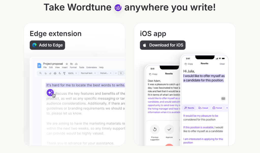 Wordtune functions as an intelligent editor integrated directly into the tools you already use every day. Once installed as a Chrome or Edge extension, or as a Microsoft Word add-in, the platform analyzes any selected text and offers multiple rewriting options in real time. You can choose to make a paragraph more formal, more casual, more direct, more descriptive, or simply better written. You don’t need to switch windows or copy and paste: you select the text, the Wordtune floating menu appears, and within seconds you have ready-to-apply alternatives.