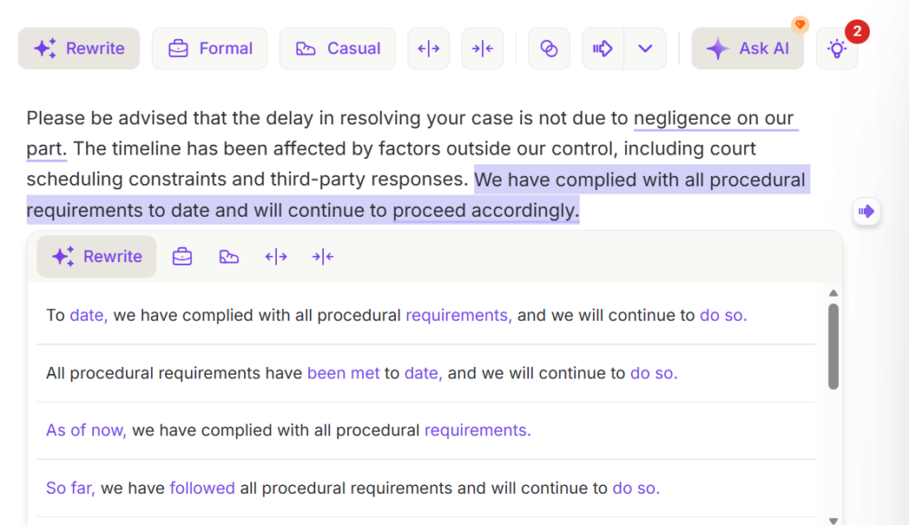 To demonstrate this functionality, we entered a legal paragraph with an initially cold and defensive tone into Wordtune, similar to an email addressed to an unsatisfied client. Upon selecting the text and clicking “Rewrite,” the platform automatically generated several improved rewriting options below the original content. Each alternative kept the legal meaning intact but adjusted the tone to make it clearer, more empathetic, and more professional, allowing you to choose the most appropriate version based on context.