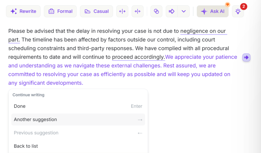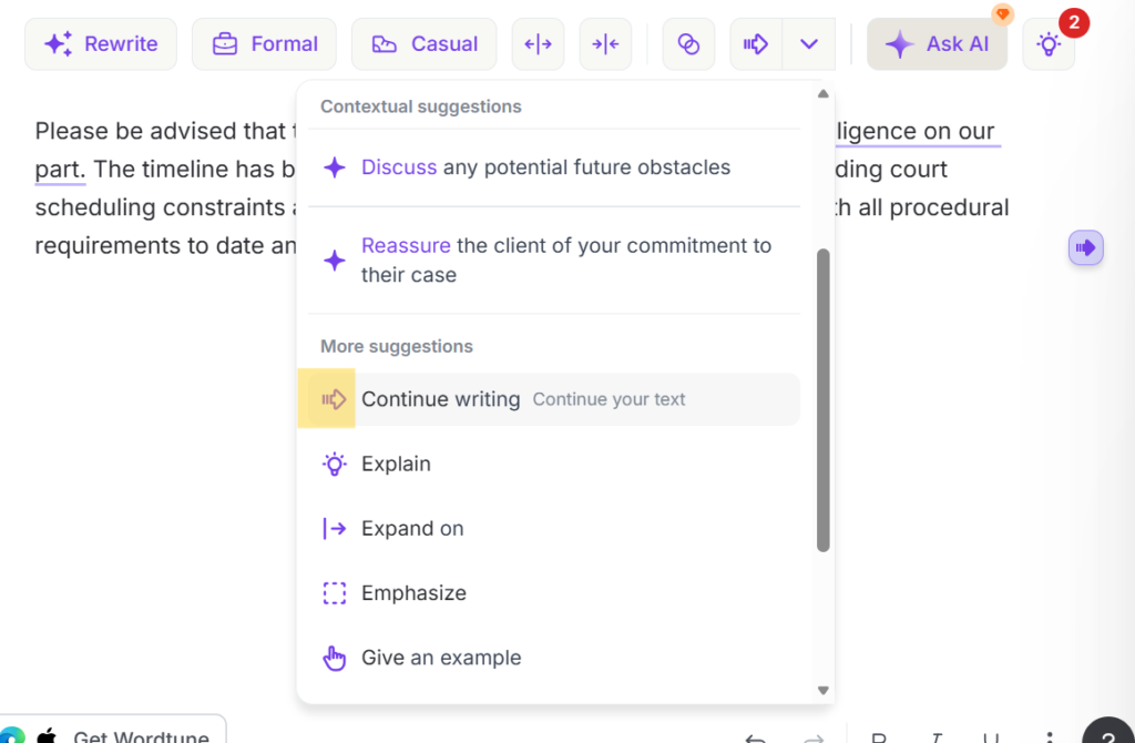The platform also includes text expansion and continuation functionalities. If you’re stuck in the middle of a legal argument or need to develop an idea in greater depth, Wordtune can suggest continuation phrases based on previous context. This is especially useful when drafting lengthy memos or reports, where maintaining narrative flow is essential. Additionally, the tool is surprisingly fast: suggestions appear almost instantly, allowing you to review complete documents without interrupting your workflow.