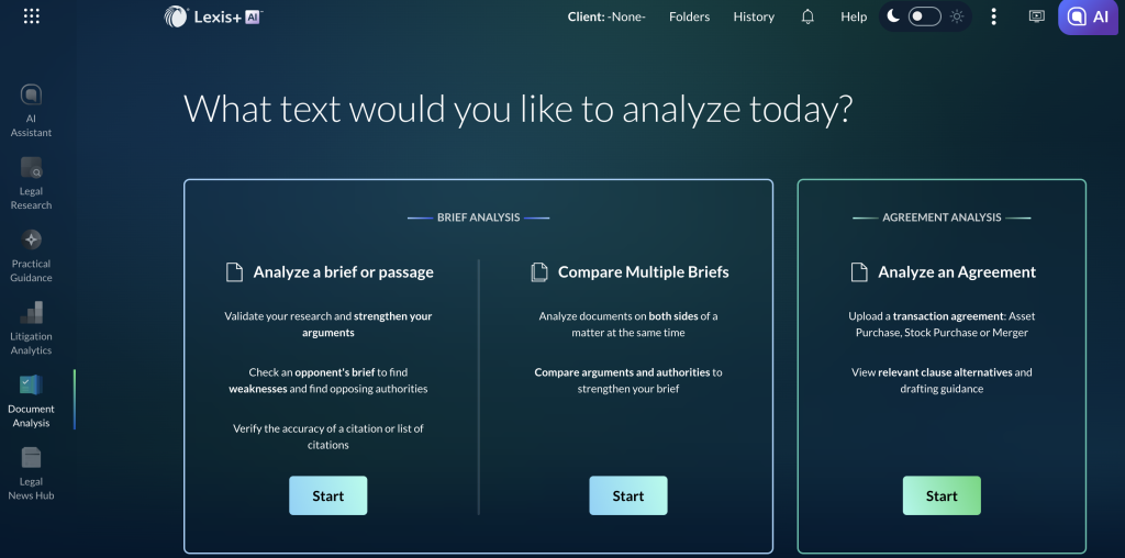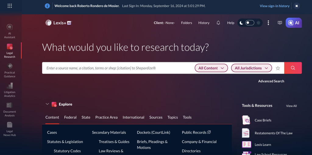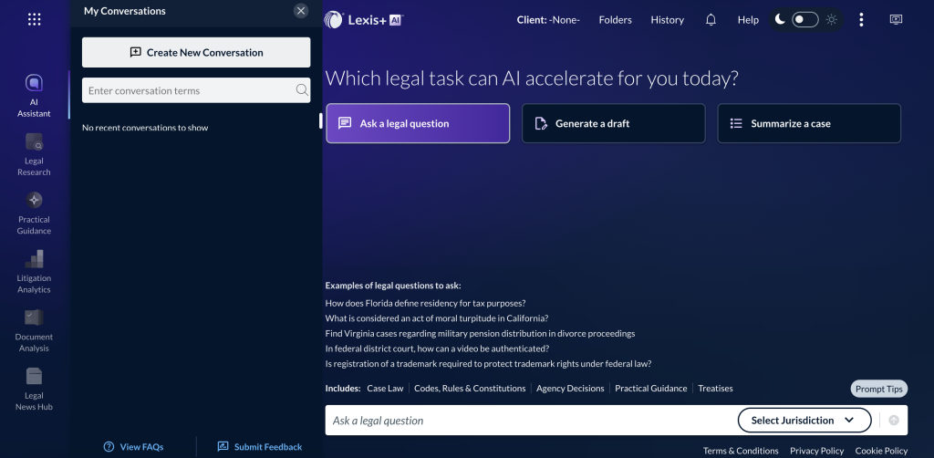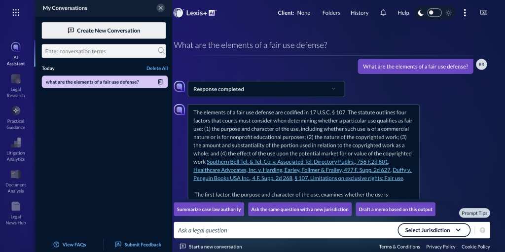 Upon login you jump right into the AI Assistant module. Its A.I.-powered natural language search engine allows users to query the system in plain English, removing the need for precise legalese or cumbersome keyword searches. This capability not only saves time but also improves the accuracy and relevance of the search results, making the research process far more efficient. Whether you’re asking for recent cases on breach of fiduciary duty in a specific jurisdiction or trying to uncover obscure legal precedents, Lexis+ AI delivers the most pertinent findings without requiring constant query refinements.