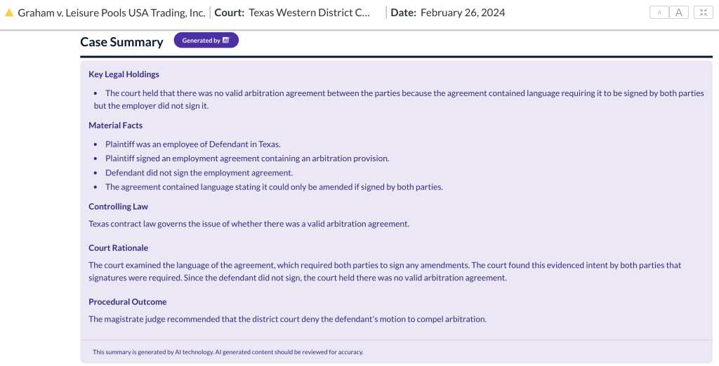 I liked the options that were given beyond the substantive response. Whether summarizing case law authority, or drafting a memo based on the results, the AI Assistant provides some useful default prompts. I had the system draft a memo based on the results and I found it to be a good first draft. As I have mentioned in previous reviews, ideally you are using any A.I. drafting support for a first draft so you don’t have to start from scratch (If you are expecting a final product you will be disappointed). More than just an integrated research tool, it helps users draft initial legal documents such as motions, briefs, and contracts, seamlessly integrating research findings into the drafts. This feature is particularly useful for lawyers looking to support their arguments with up-to-date case law and statutes, saving hours typically spent cross-referencing research with drafting. The system suggests relevant legal precedent as you write, ensuring that your documents are both thorough and legally sound from the outset.