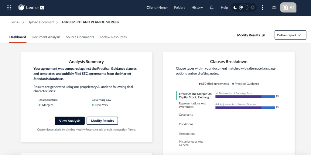The Document Analysis module was very interesting. Once there you have the option to analyze a brief, compare briefs, or analyze an agreement. The brief analysis tool scans uploaded briefs to suggest overlooked cases, statutes, or legal principles, effectively acting as a final quality control check before filing. I love the use case for A.I. here, though reliability needs to be tested further. I was disappointed in the limited scope of the Agreement Analysis option which was limited to Asset Purchase, Stock Purchase or Merger agreements. I did perform a sample analysis of one such agreement, however, and I did like the analysis. I was able to dive in further to see some suggested clause changes.