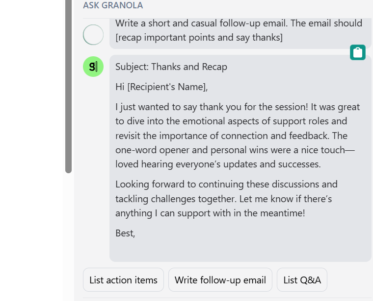 And —this truly surprised me— you can interact with Granola right from the summary. For example, after a meeting I asked it to write me a casual follow-up email to thank participants and recap key points… and within seconds, it delivered a polished draft with a subject line, personalized greeting, and a thoughtful closing. I just had to copy, paste, and send. Honestly, it saved me at least 15 minutes of mental effort.