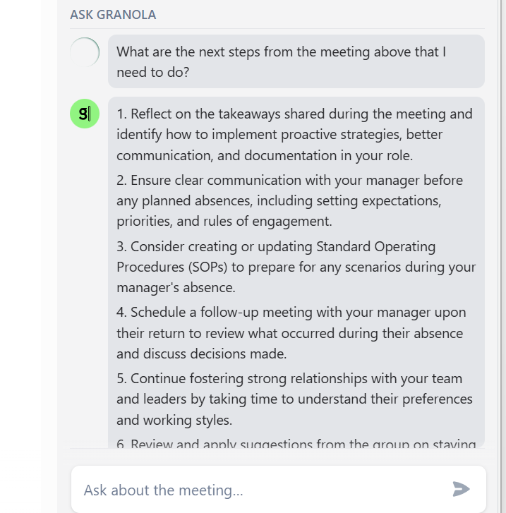 The tool organizes all that information in a very intuitive dashboard, where you can search any keyword and instantly jump to the relevant snippet, with its context and exact timestamp within the meeting. But it doesn’t stop there. If you have questions or want to clarify something after the meeting, you can type directly to Granola from the same summary. For example, I asked it what next steps I needed to take based on the conversation, and it gave me a clear, organized, and actionable to-do list. It’s like having a personal assistant that not only listens but also understands the context and helps you act on what matters.