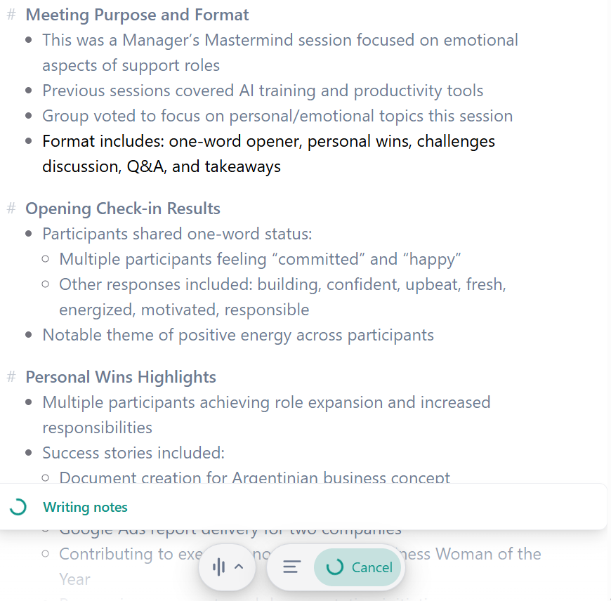 And here’s another bonus I discovered using Granola. Once the meeting ends, you can further enhance the notes the tool captured. You just click the Enhance Notes option at the bottom of the panel, and the AI automatically reorganizes the information, generating a cleaner, more structured summary with clear sections like purpose, attendees, key topics, next steps, and conclusions.