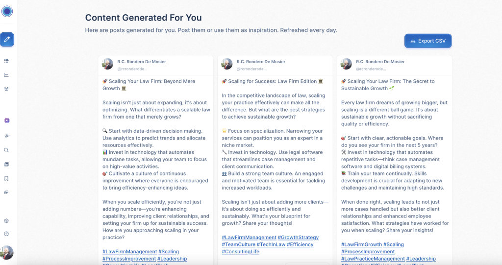 At its core, Taplio simplifies content creation. Its AI-powered post generator is ideal for busy legal professionals who need to create engaging LinkedIn content but don’t have the time to craft posts from scratch. You can input a few key ideas or topics, and Taplio will generate thoughtful posts that align with your professional voice. This tool takes the guesswork out of content creation, helping you maintain an active presence without being glued to the platform. Here you can see draft posts that the A.I. tool created for me after several weeks of learning what content I liked posting and what content performs well related to legal operations (follow me on LinkedIn if you haven’t yet to see it in action). Once I have a draft, a few quick edits make it ready for posting.