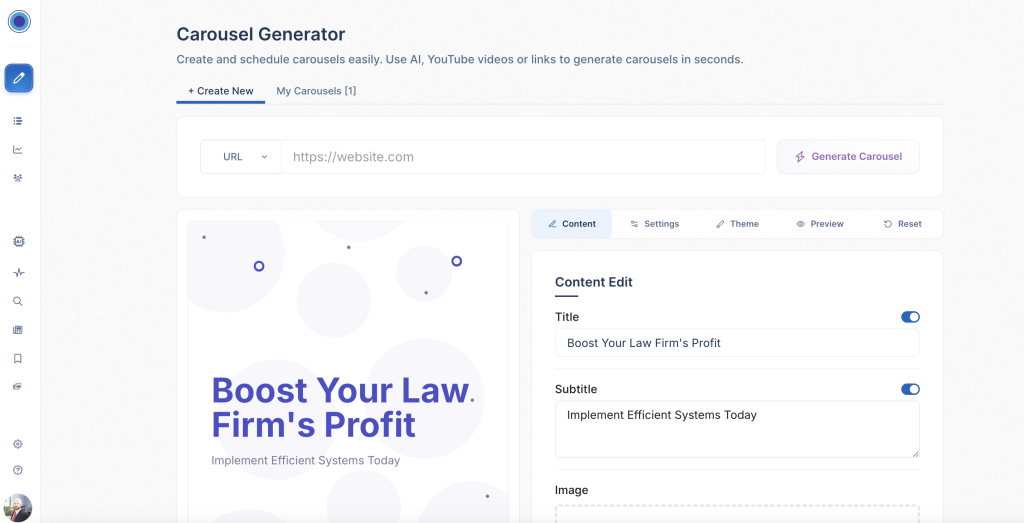 Taplio also excels at making your content more engaging with its Carousel Generator, a tool that allows you to create dynamic, eye-catching carousel posts. These are great for breaking down complex legal topics or presenting case studies in a visual format, making your content stand out amid the noise of other posts. It just so happens that Carousels receive quite a bit of views on LinkedIn. Having a tool to help you create them in a time effective manner is invaluable.