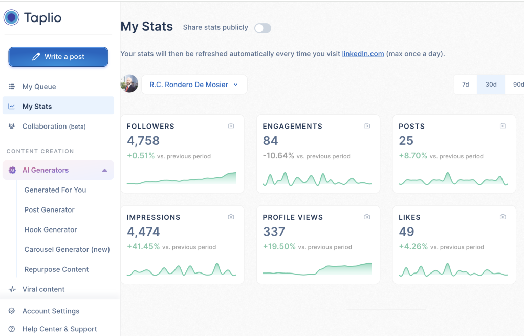 Understanding what content works best is key to any personal branding strategy, and Taplio’s Analytics Suite offers comprehensive insights. You can track metrics such as follower growth, post engagement, and reach, helping you fine-tune your strategy over time. Knowing which posts perform well allows you to focus on the types of content that attract the most attention, ultimately driving more business. In the months I have used Taplio, it has tracked my engagement and helped me see how well posts perform, helping me to craft better content week after week.