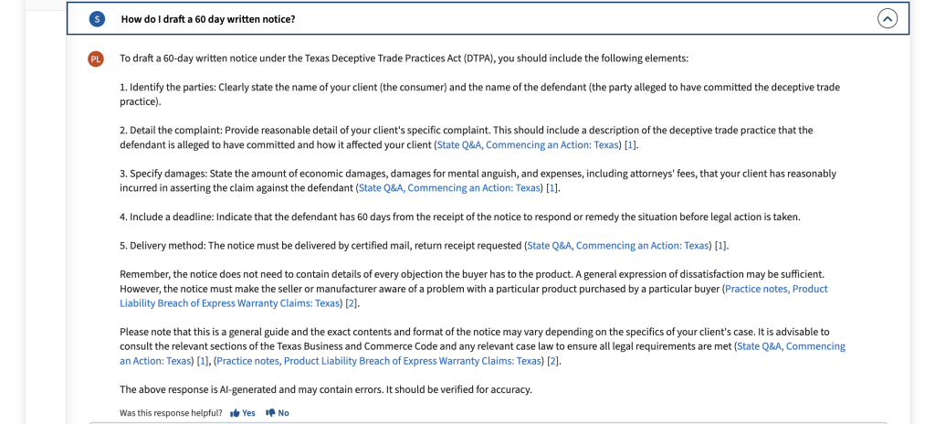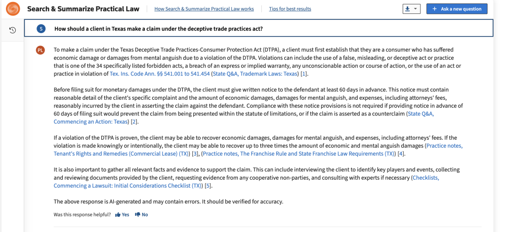 I ran a query about elements needed to make a DTPA claim and Practical Law came back with elements and and links to practical guides an attorney could go to in order to draft commencement of an action.