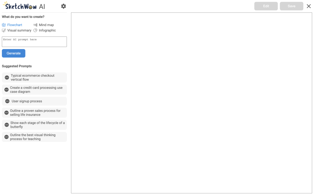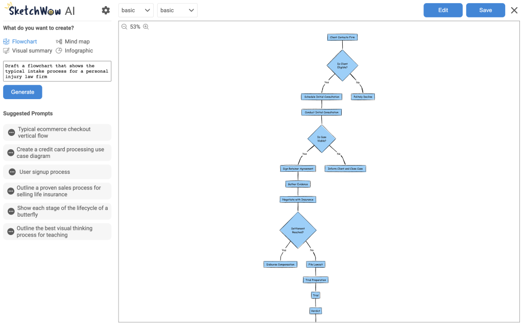 But, since this is an A.I. focused newsletter, I will only focus on the SketchWow A.I. feature, which, is impressive enough on its own, especially to get started. Head to the SketchWow A.I. option to the left you will head to a blank canvas. From there you see 4 options for diagrams to create: Flowchart, Visual Summary, Mind Map and Infographic. For each of those options you will be given suggested prompts to get the creative juices flowing. For this review I used each option with a law practice use case.
