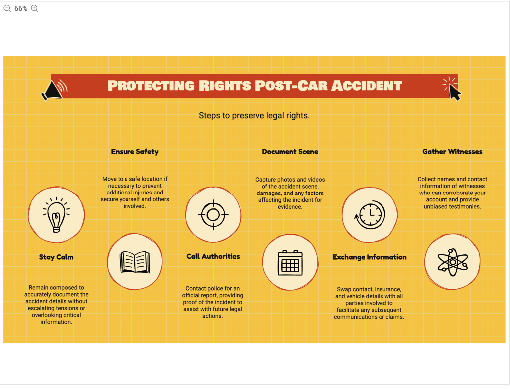 I started with the Visual Summary option. The A.I. will generate a visual based on your prompt. Now, don’t expect the visual to be customized exactly for you, but as I always say, the first draft is the hardest. With a simple prompt SketchWow will feed that through OpenAI and deliver to you what it thinks you want. You will be presented with a number of template designs. Then you can inspect the output and reword as needed. From there I chose a random one. I ask SketchWow to generate a visual aide that I would hypothetically use in a blog or on social media showing the steps to take to preserve your rights in the event you are in an accident.