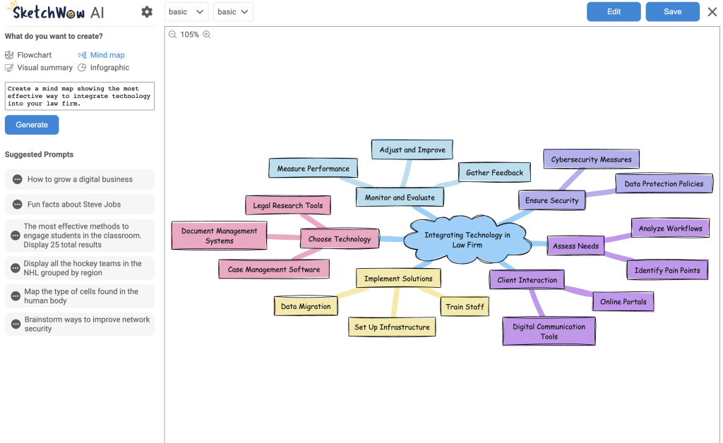 Next I turned my attention to the Mind Map. In this case I prompted the system to create a mind map that shows an effective way to integrate technology into your law firm.