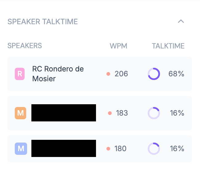 One of my favorite nifty features is the speaker talk time tracking. If you know me, you know I’m a talker. Whether it’s internal meetings or client communications, sometimes listening is more productive than talking. Here’s a snapshot of a conversation where I was training clients on intake process improvements. Reflecting back, I realized I dominated the discussion. In the next meeting, I cut my talking time down by 20% and found it to be a much more productive meeting.