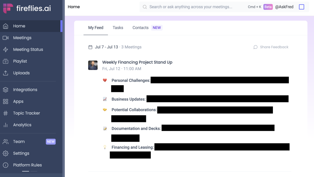 For example, check out the Fireflies dashboard. Not only is it easy to navigate, but it also gives you a summary of topics discussed in your recent meetings. It’s designed to go way beyond basic transcription.