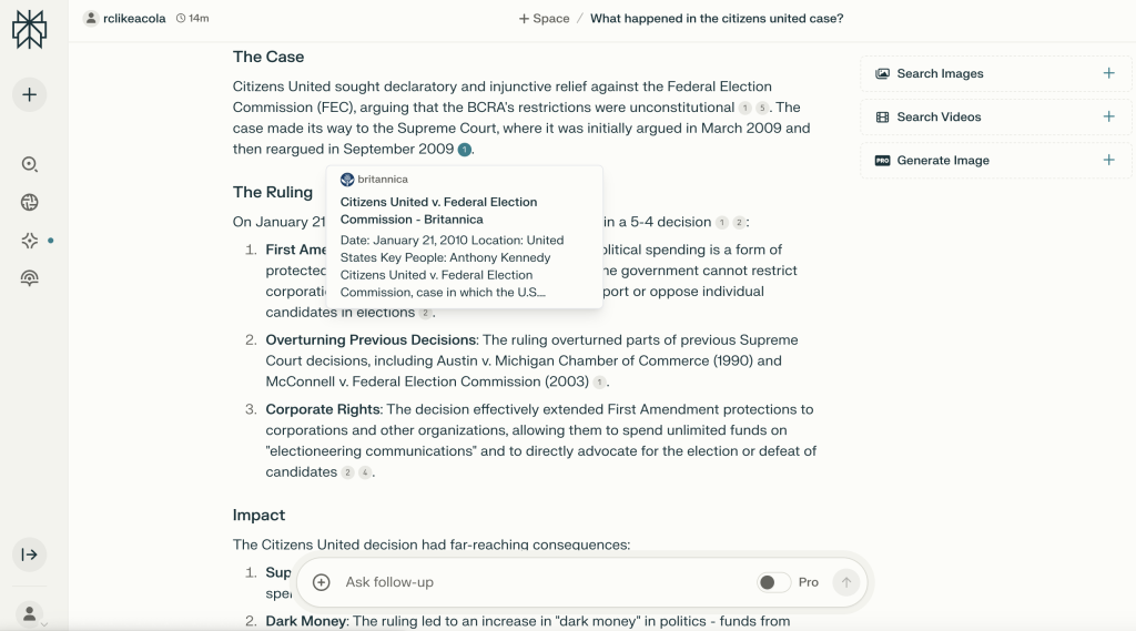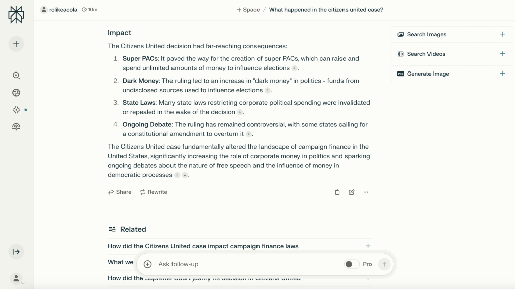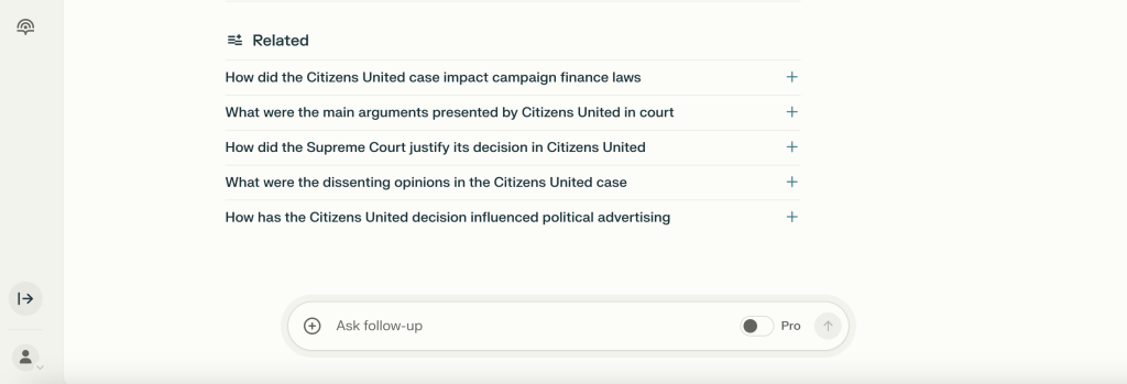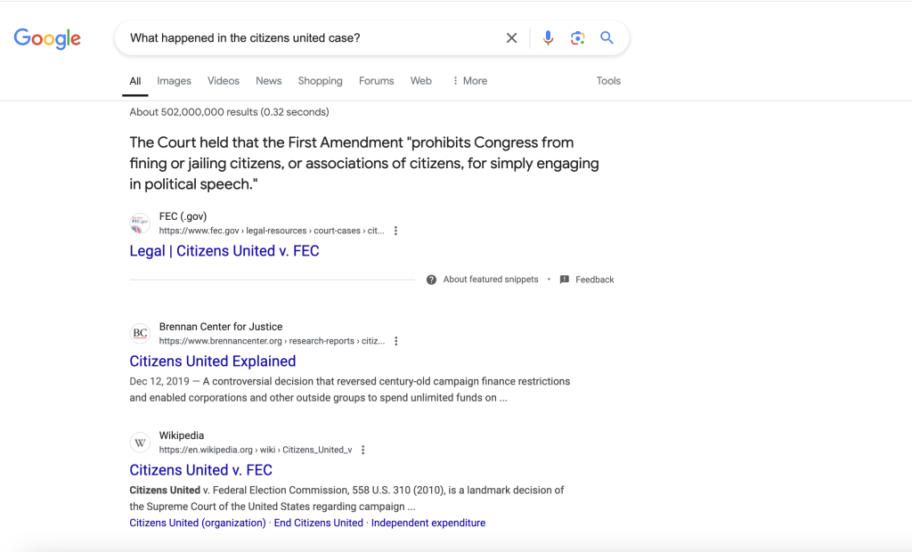 Since you are seeing this on Election Day (or a week after on LinkedIn – maybe we’ll have a President Elect within 7 days? 🤷♂️), I thought I would do a search that is election related. I used a sample search of: “What happened in the Citizens United case?” Simple enough. To show you how great Perplexity is, I did the search in Google. See what I got back: