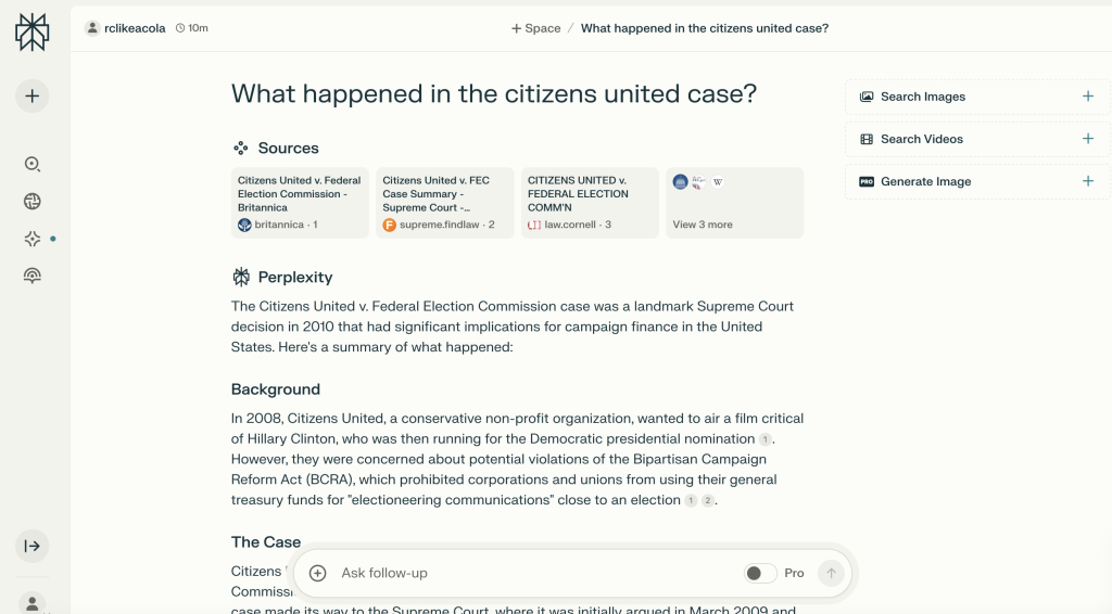 Imagine no more toggling between dozens of tabs or slogging through dense texts. You query, and Perplexity serves up a clean, reference-laden response. Want to go deeper? You can click the embedded links to see the source material—a true blessing when you’re trying to ensure the AI didn’t just make it all up. Here we see a Background, the Case Summary, a Ruling and Impact. And at the bottom you see a Related section that prompts follow up questions.
